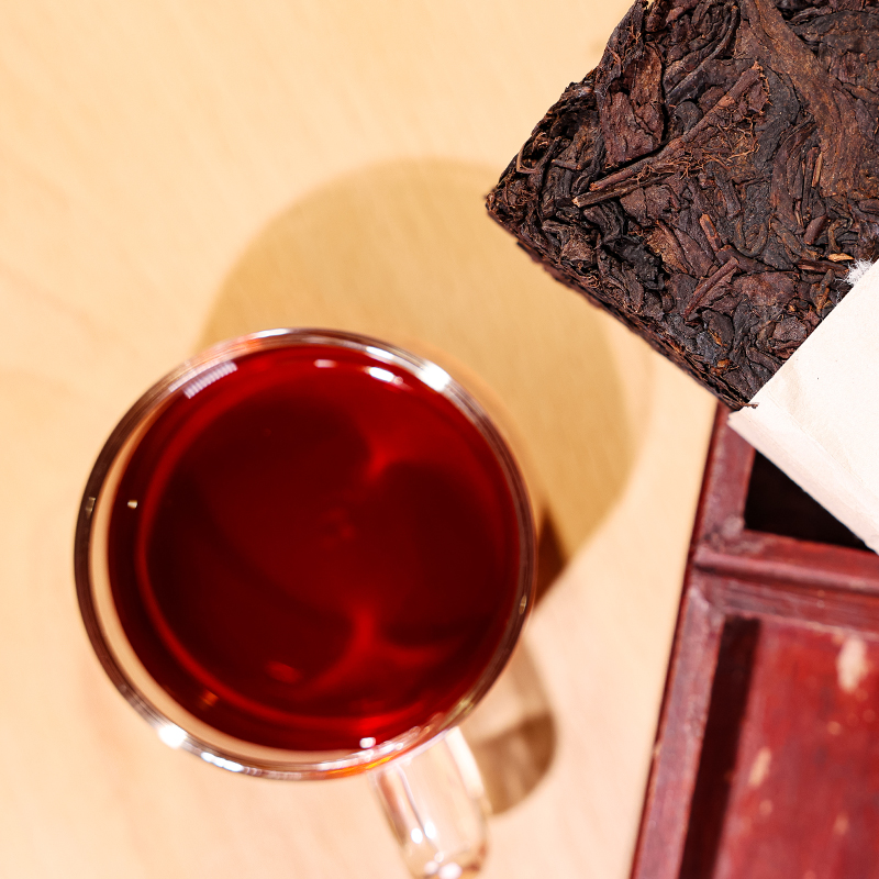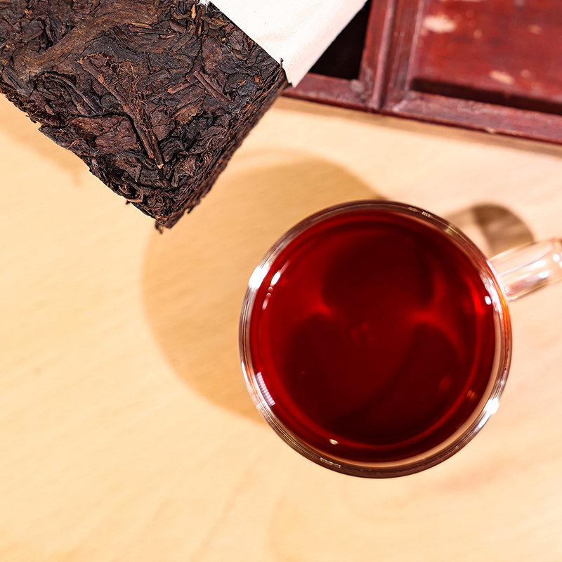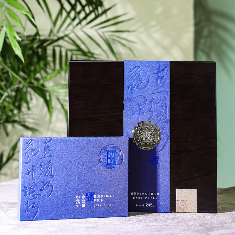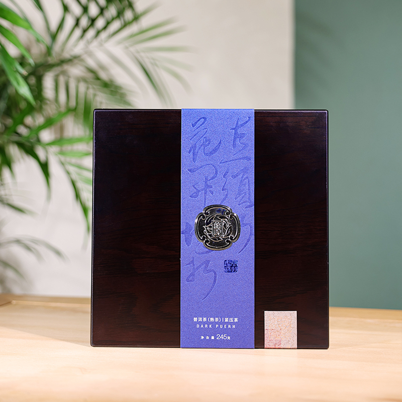 这是一款90年的陈年熟普/茶砖外形十分完整/砖形端正/厚薄均匀/砖面色泽油亮/条 索清晰/茶砖背面有老茶特有的乳钉状凸起/开汤后/樟香/陈香浓郁/茶汤红浓清透/汤 感稠滑油润/滋味陈醇润滑/绵密润喉/回甘悠悠/生津持久/精致实木包装/珠光湖蓝封 笺/印有唐代《金缕衣》经典名句“花开堪折直须折/莫待无花空折枝”/好茶难得/且喝 且珍惜